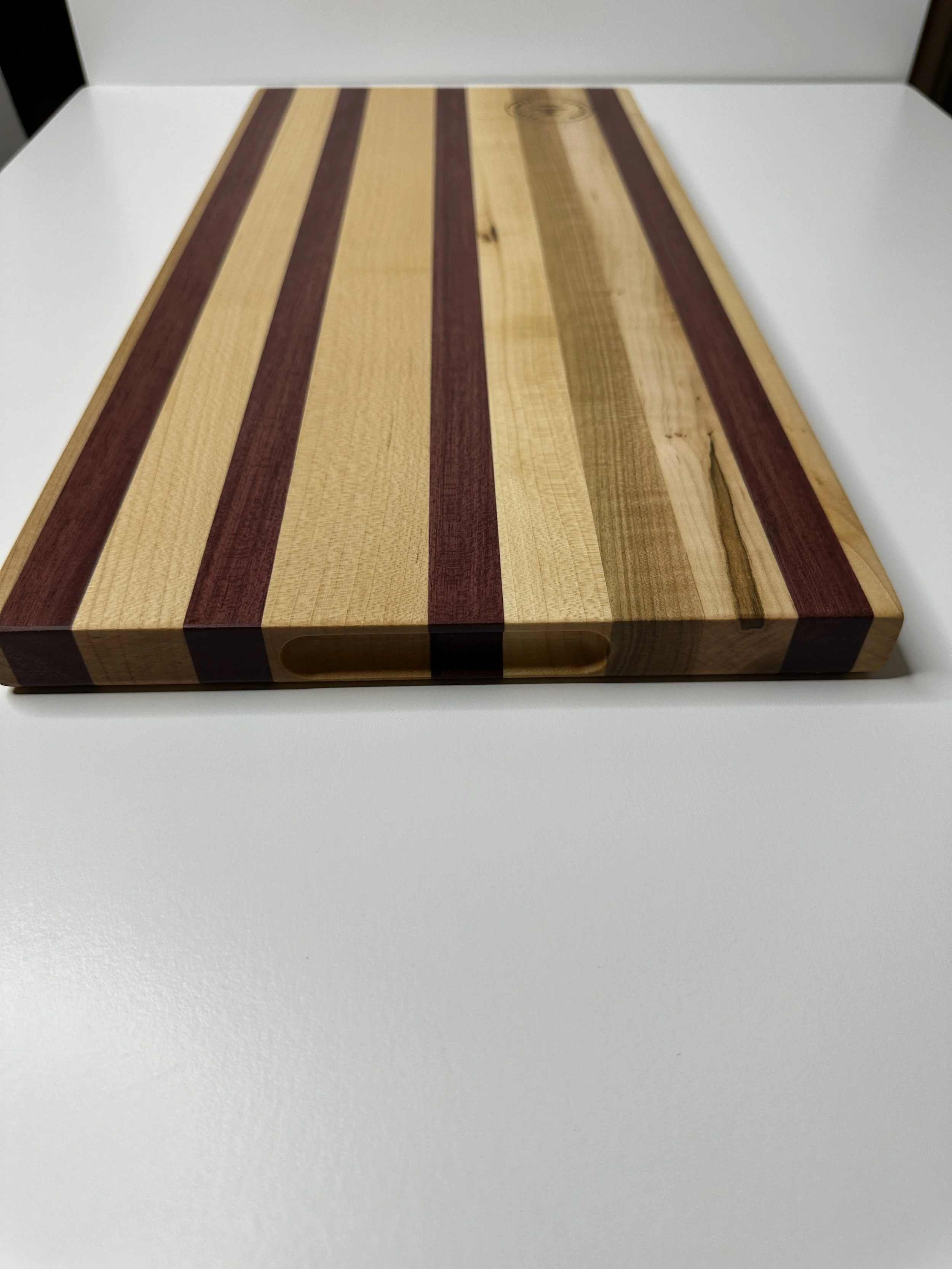 Meet the colorband cutting board - a work of art within our exclusive colorband collection. This masterpiece is crafted from the finest maple, walnut, and exotic purple heart wood, designed for those who savor the finer details. It's not just a cutting board; it's a statement of sophistication and a nod to your discerning taste.